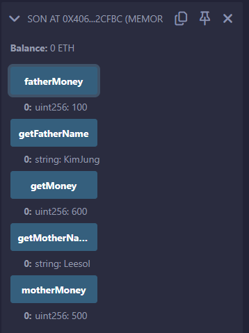 son 컨트랙을 배포한 결과는 다음과 같으며, 아버지에게 100, 어머니에게 500을 받아서 getMoney 함수는 600을 리턴한다.