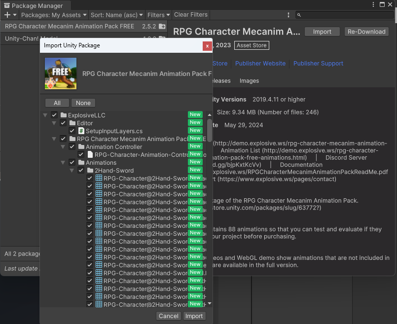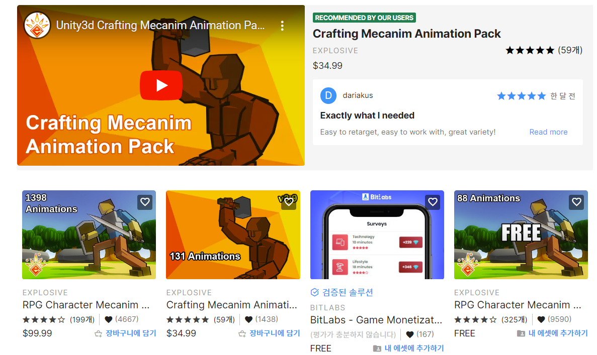 유니티 에셋 스토어에서 플레이어 캐릭터 애니메이션을 구현하기 위해 "RPG Character Mecanim Animation Pack FREE" 다운 받는다.