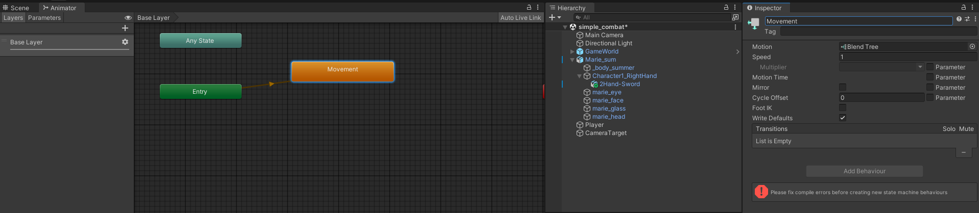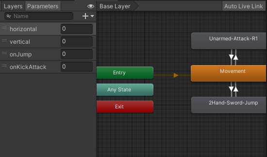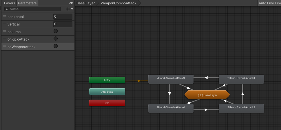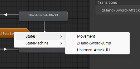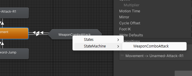 Base Layer로 돌아가 Movement에서 WeaponComboAttack으로 이어지는 트랜젝션을 생성한다.