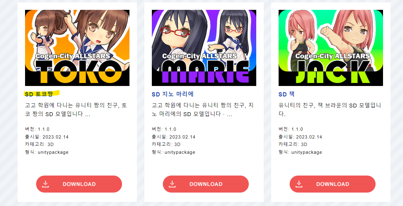 이번 실습 진행을 위해서는 영상 하단에 게임 월드 패키지를 다운받고 Unity chan! 페이지(https://unity-chan.com/)에서 Data Download를 누르고 라이센스 동의한 후 아래 에셋을 다운받은 후 유니티에 임포트한다.