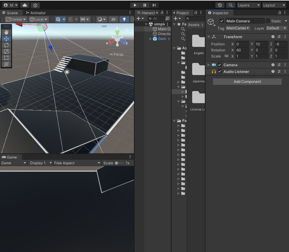 Asset의 Prefab 폴더에 있는 게임월드를 hierarchy view에 드래그 한 후 main camera를 position을 설정한다.