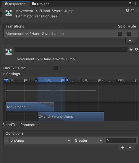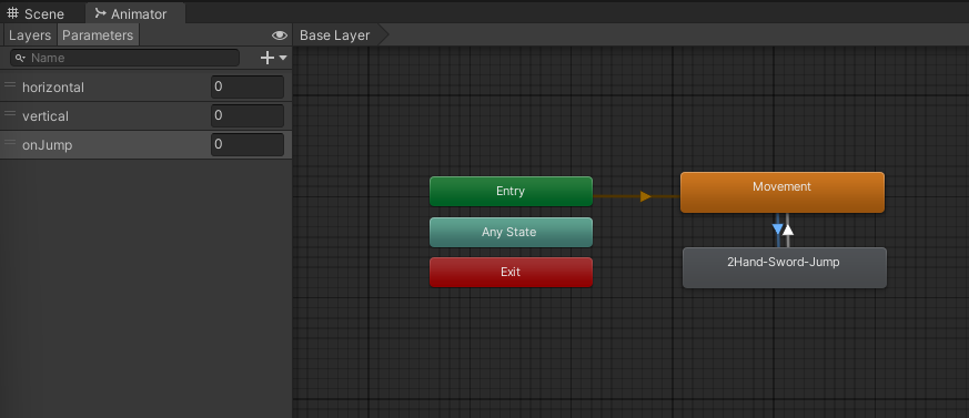 이후에 상태전이를 생성해서 movement에서 jump로 전이하는 조건 설정을 위해 트리거 타입의 파라미터 onJump를 생성한다. 그리고 상태 전이에서 Has Exit Time을 해제한다.