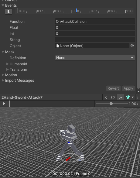 현재 사용하고 있는 공격 animation에 가서 event에 원하는 프레임을 설정하고 add event를 이용해 함수를 생성한다. 호출을 원하는 함수를 등록한다.