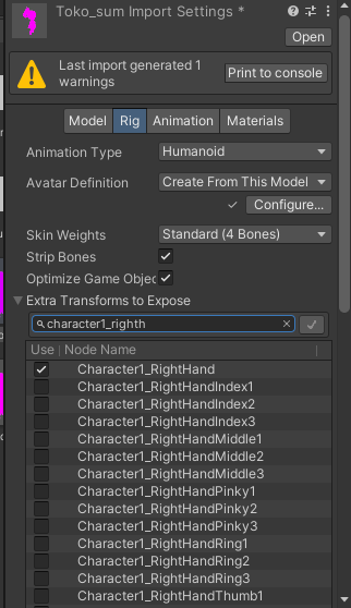 이후 빈 오브젝트를 생성해서 player로 사용할 예정이다. 다운받은 캐릭터 에셋을 적용하기 전, model의 크기를 Scale Factor를 2로 키워 모델의 크기를 키워주고 Rig 탭 Optimize Game Object 최적화, 오른속에 무기들기때문에 Right hand 체크한다.