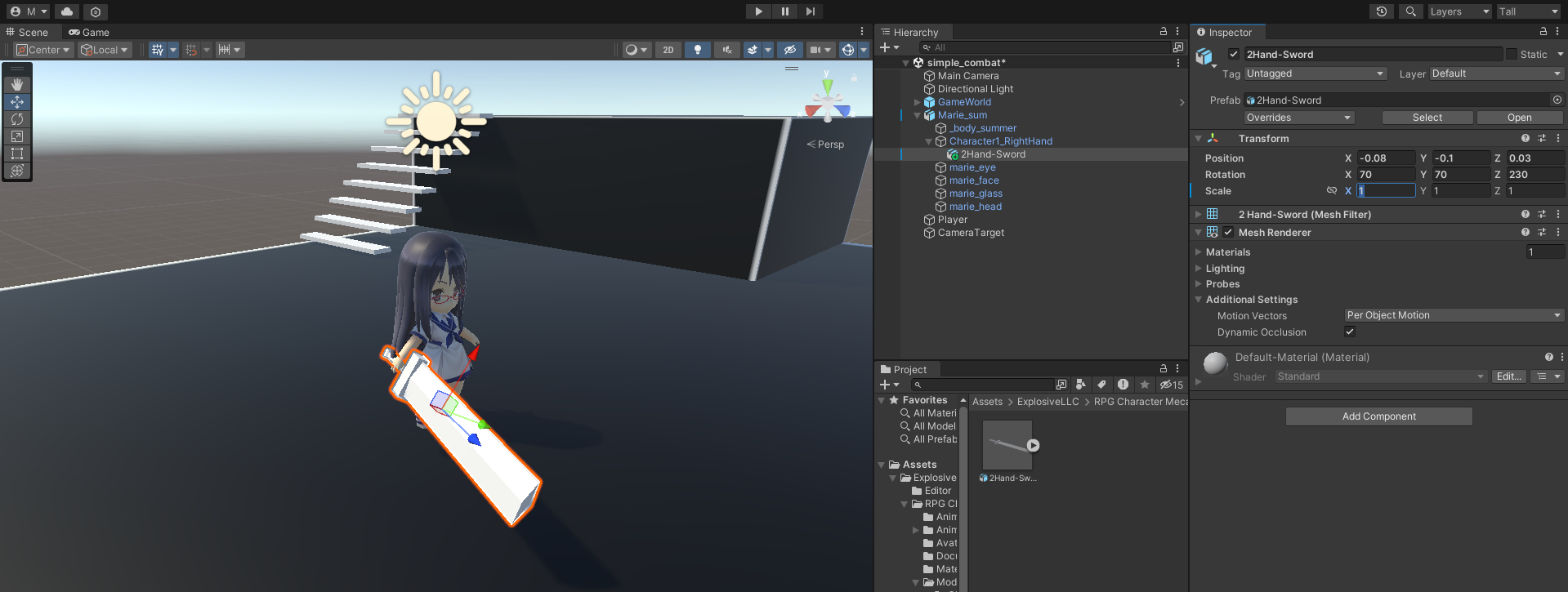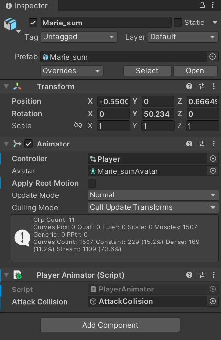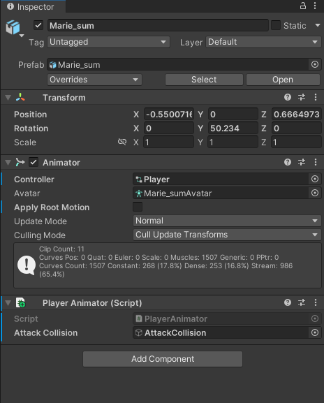 특정 프레임에서 호출하도록 스크립트를 설정하였다. 이후 Marie_sum 캐릭터 오브젝트에 등록된 playerAnimator 스크립트에 AttackCollision에 생성한 충돌박스를 넣어준다.