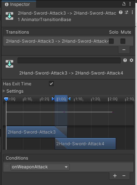 공격에서 공격으로 이어지는 상태전이를 선택하고 Condition에 해당 파라미터를 등록한다. 이때 Has Exit Time은 true로 둔다. 공격이 완전히 끝난 이후에 다음 공격을 할 수 있도록 하기 위함이다.