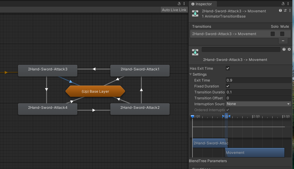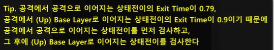 모든 공격에서 Base Layer로 들어가는 상태전이는 Exit Time은 0.9, Transition Duration은 0.1로 설정한다.