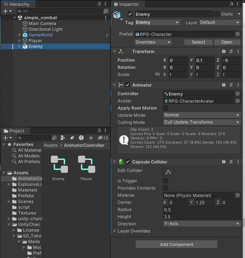 Player의 공격을 받게 될 Enemy 오브젝트를 생성하고, Enemy AnimationController 생성하여,Enemy 오브젝트에 적용 후 Apply Root Motion을 해제한다. Capsule Collider 컴포넌트를 추가 후 범위를 지정한다.