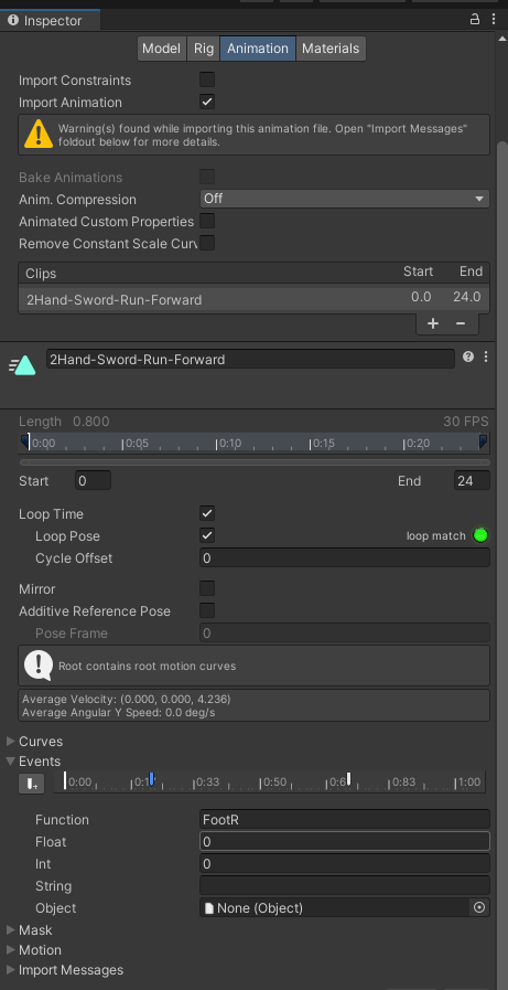 스토어에서 받아온 RPG 캐릭터 에니메이션에는 이미 이벤트 함수가 설정되어 있기 때문에, 실습에서 사용하는 애니메이션 클립의 이번트에 가서 이벤트 함수를 삭제한다.
