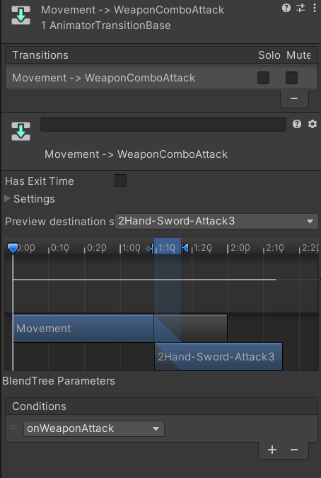 해당 트렌젝션은 원할 때 바로 갈 수 있도록 Has Exit Time을 풀어준다. Condition에 OnWeaponAttack을 등록한다.