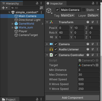 이전 강의 Navigation mesh 에서 작성한 스크립트랑 동일하며, main camera의 타겟 추적, 타겟과의 거리 조절, 회전을 제어하는 스크립트를 작성한다.