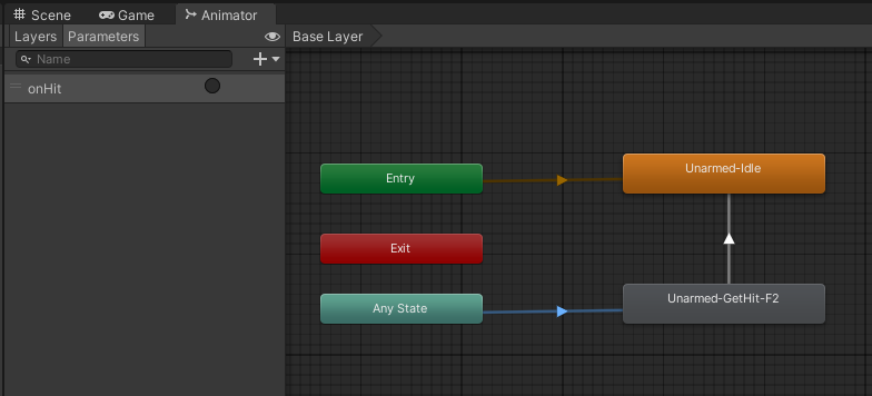 Any state에서 전이하는 조건 설정을 위해 trriger 파라미터 onHit를 생성해서 Condition에 설정한다. Has Exit Time을 해제한다.