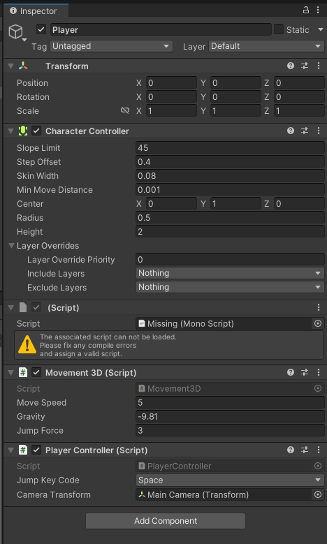 이동이 가능한 오브젝트에 이동 제어에 사용되는 Movement3D 스크립트 작성한다.