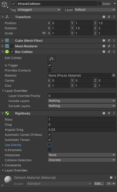 위의 스크립트를 Enemy 오브젝트에 등록한다. player 자식오브젝트 AttackCollision을 생성해서 위치와 크기를 설정한 뒤 모습이 안보이게 mesh 해제, Box Collider, Rigidbody 추가하고 각각 is Trigger 체크, Use Gravity 해제 설정을 해준다.