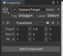 위의 스크립트를 main camera의 component로 적용한 후 타겟 변수에는 player object의 자식으로 빈 오브젝트를 생성해서 CameraTarget으로 이름을 변경 후 위치를 조정한다. main camera의 타겟 변수에 적용한다.