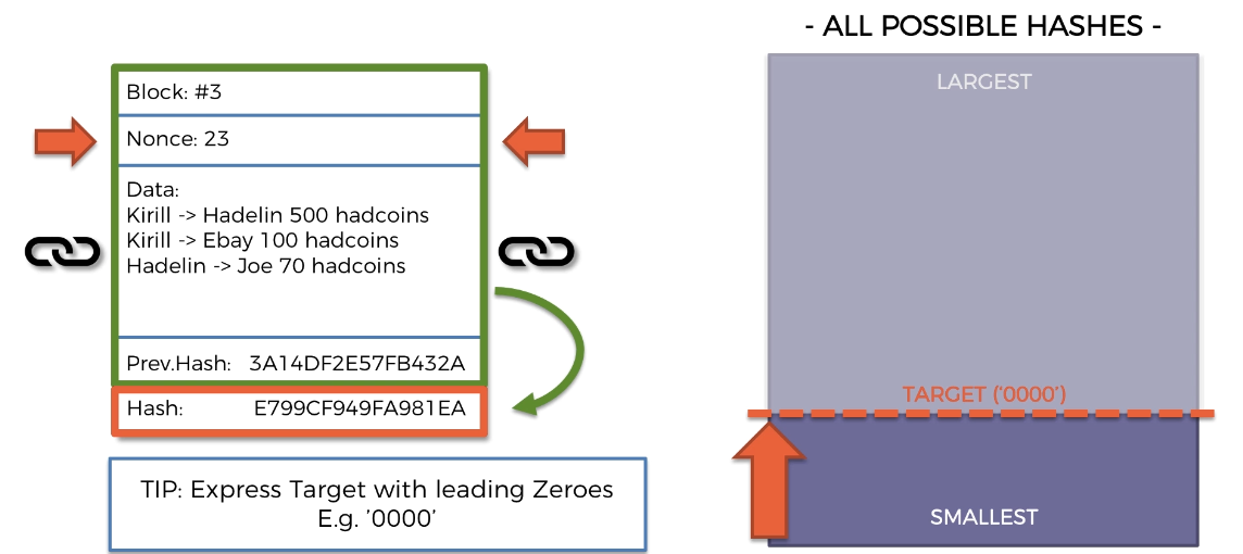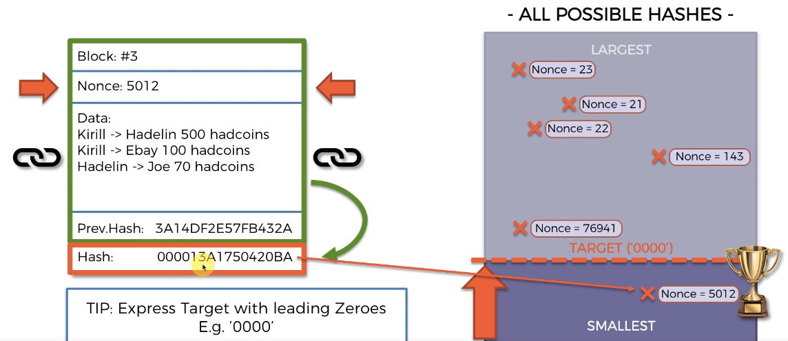 대상보다 값이 큰 해시는 고려 대상이 아니며, 블록에 대해 찾은 해시값이 대상보다 작아야 한다. 대상보다 더 클때 해당 블록체인에 대해 충분하지 않고, 해쉬값이 무조건 대상보다 작아야한다.