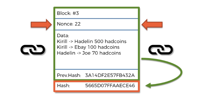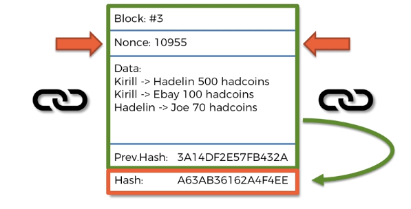 위에는 예시로 작성된 블록으로 여러 트렌젝션을 한 블록 내에 넣을 수 있다. 위의 블록에서는 블록번호, 데이터, 이전 해시 값을 가지며, 이전 해시 블록 간의 암호화 링크를 활성화 하는 부분이다.