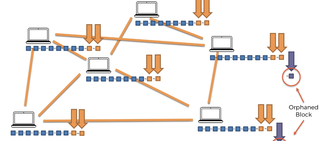 이러한 원리로 충돌이 해결 되면 떨어진 보라색 노드들은 주류 블록체인에 있지 않은 블록으로 고아 블록(Orphaned Block)이 된다. 고아 블록은 채굴자들이 채굴했지만, 블록의 트랜잭션과 보상이 더 이상 유효하지 않게 된다.