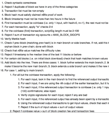 블록이 이렇게 추가되기 전에 네트워크로 전파되기 전에 각 단일 노드에서 위의 확인 절차를 거쳐 확인을 한다. 머클 해시나 이전 해시 필드 일치 여부, 타임 스탬프 등등을 확인하고 모두 통과하지 않으면 블록은 기각된다. 결과적으로 악의적인 블록이 체인에 추가되지 않도록 예방한다.