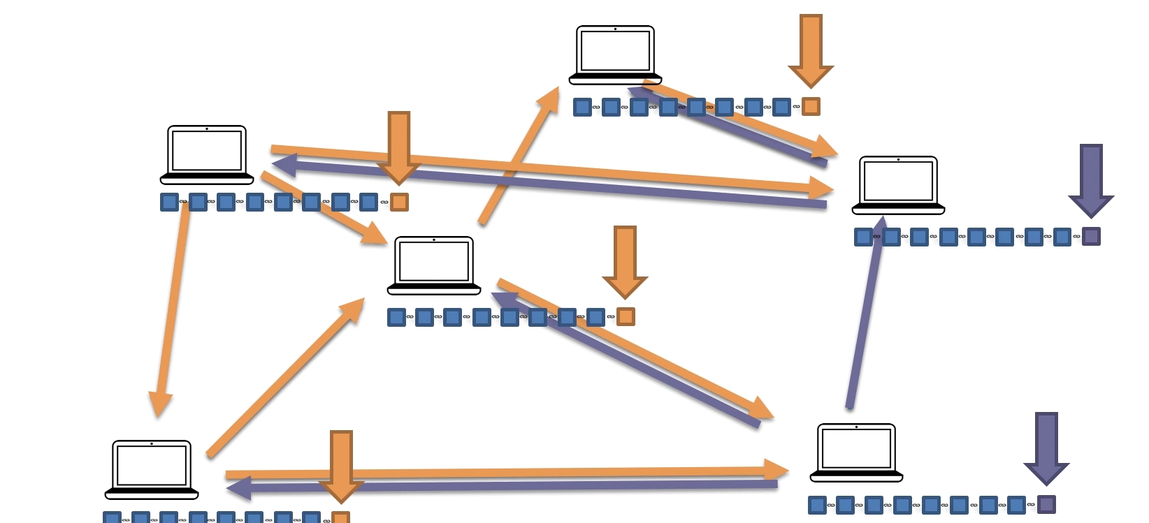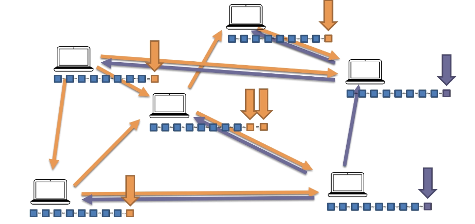 각 노드 간의 거리의 문제로 주황색 노드와 보라색 노드 간의 충돌이 발생한다. 주황색 노드는 보라색 노드에게 주황색 블록을 추가하라고 할 것이고, 반대로 보라색 노드는 보라색 블록을 추가하라고 할 것이다,